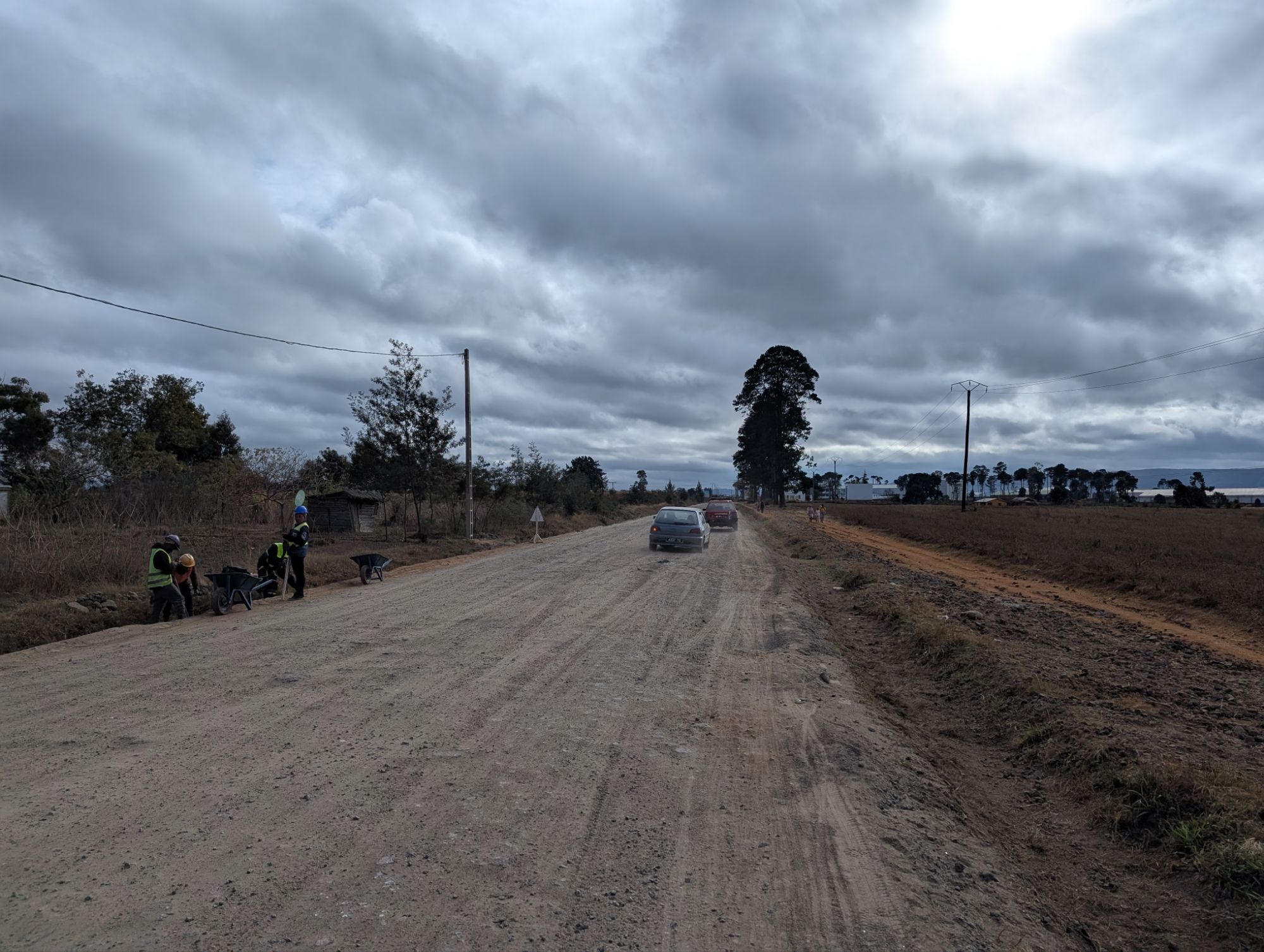 One of the first gravel patches. There was a short section of construction here. For much of the next ~45 minutes the road was calm, presumably because vehicles were stopped at construction point while we cycled past.