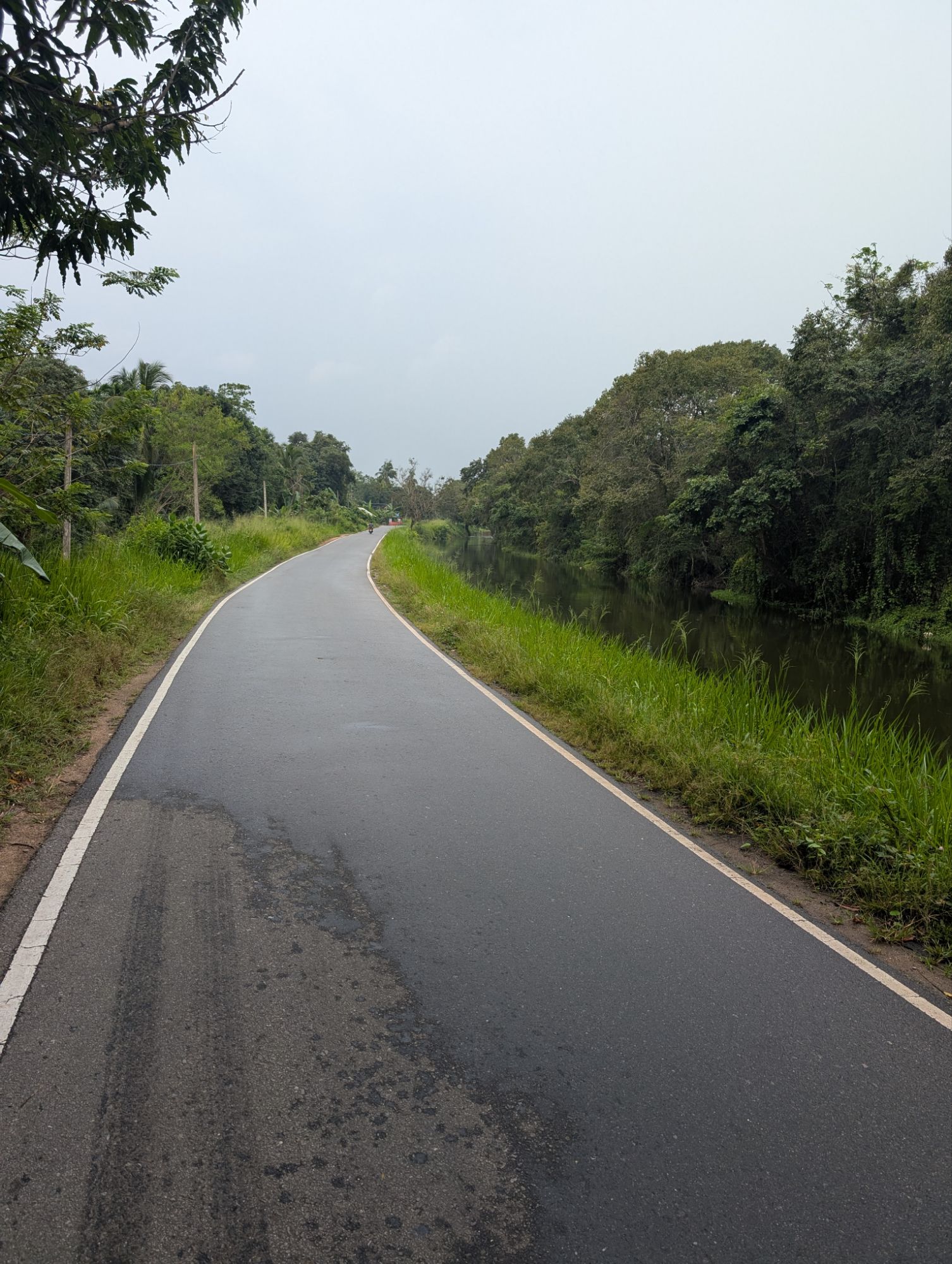 Followed this small path for a while. Barely big enough for a big red bus and a bicycle to pass. It followed a canal. The road was wet but there was almost no rain.