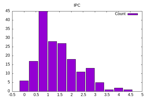 After adding general parsing of measurement statistics, I can now also create a statistical summary across all ~170 benchmarks as shown below. This lets me see for example the minimum IPC, maximum IPC, mean IPC and standard deviation. This will then provide some information whether a particular workload is “low” or “high” in a metric and how significantly.
