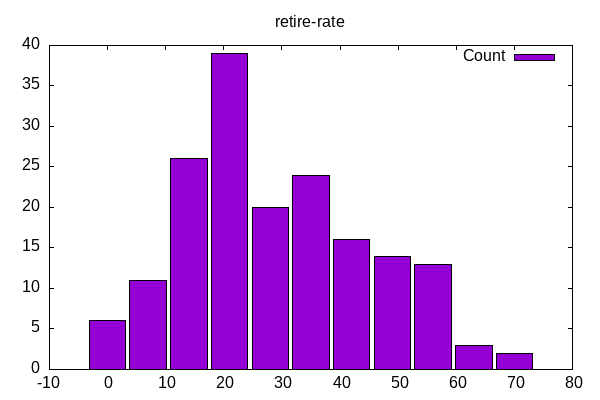 Retirement go from 0.8% to 76.2% with a mean of 32.3% and standard deviation of 15.6%. A retirement rate over 64.5% would be two standard deviations above the mean.