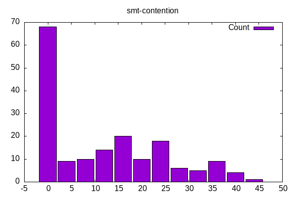SMT contention is the number of slots going to the “other” core in a hyperthread. The large bar on left reflects both single-threaded workloads and those MPI workloads on physical cores.