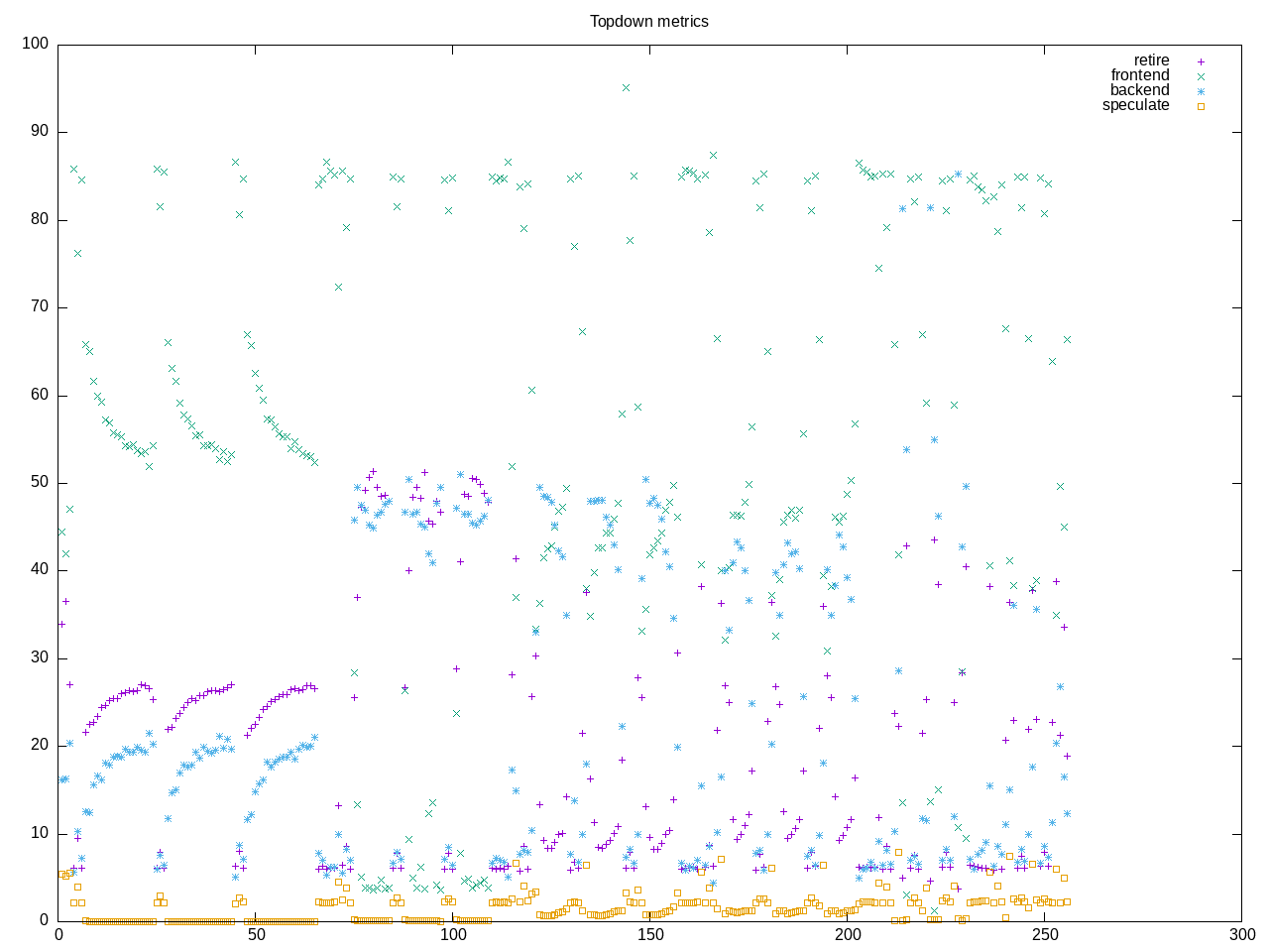 Topdown profile shows frontend stalls as high and some variation between workloads and over time.