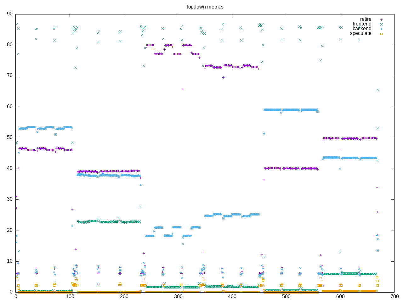 Topdown profile shows variations among the workloads with retirement rates in the 70s for two workloads and backend stalls limiting other workloads. Frontend stalls look to be low except for the second workload and brief time at start of each run.