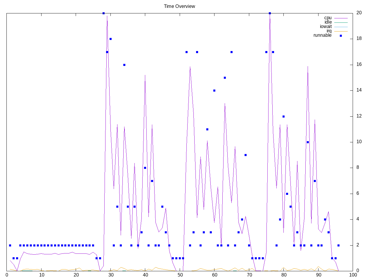 A test to see how long it takes to build the Apache web server. This is a quick running test taking barely 20 seconds. Curiosly, there seems to be a longer preparation phase before the actual run itself. The number of processes jumps to one per core but quickly subsides.