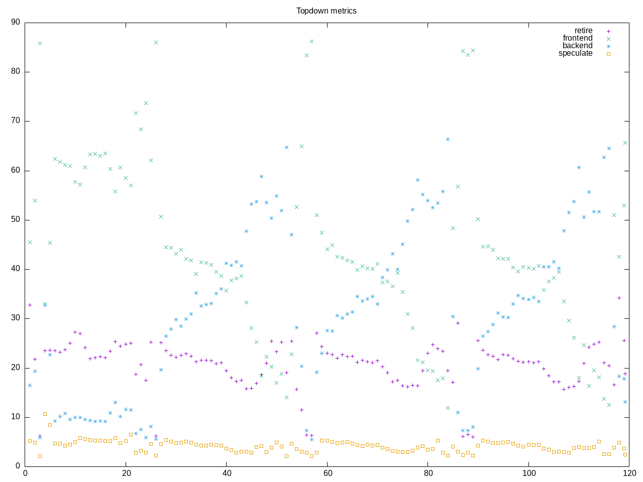 Topdown profile shows a familiar pattern for compiler builds, high and declining frontend stalls, rising backend stalls and overall a lower retirement rate.