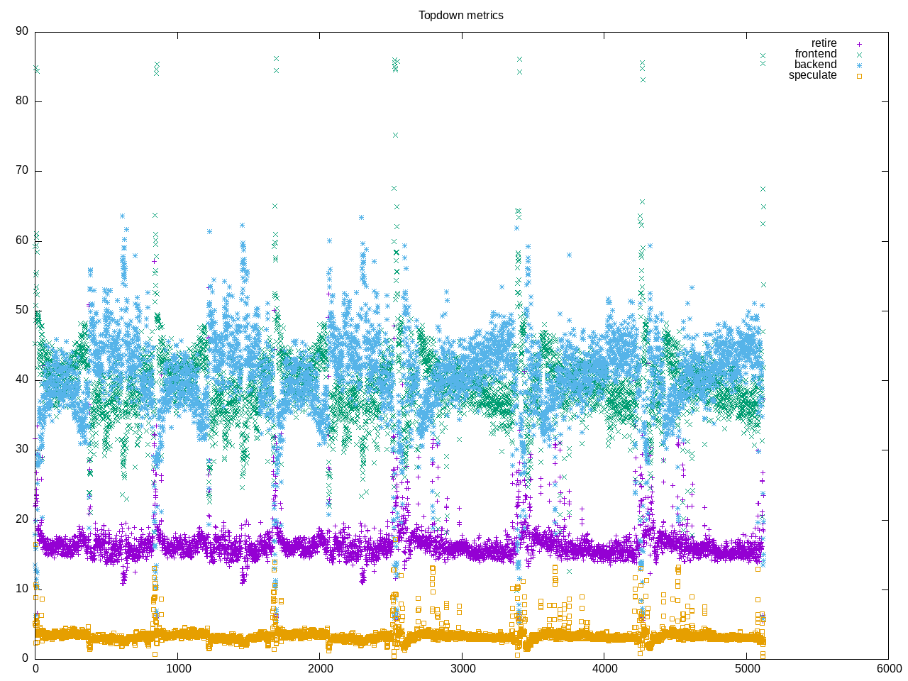 Overall topdown profile is a workload dominated by frontend stalls with a lower retirement rate. This is similar to other build-* workloads, though backend/memory stalls are slightly higher with LLVM and frontend stalls are slightly lower.