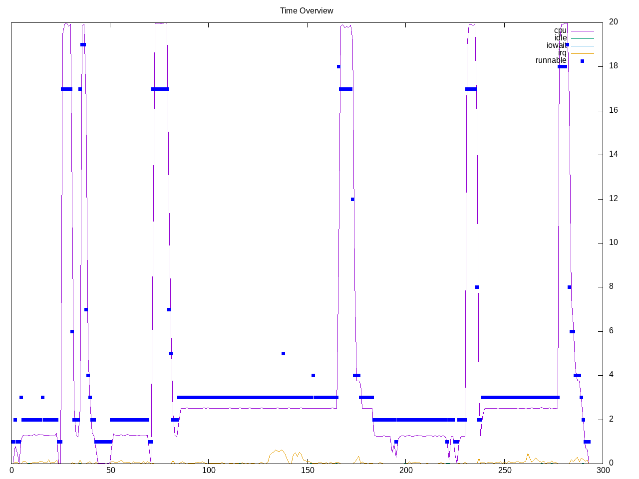 This workload builds the python reference implementation. There are two builds – a quick default build followed by a longer running release build with PGO and LTO that takes much longer. These builds appear to have just a few processes much of the time.