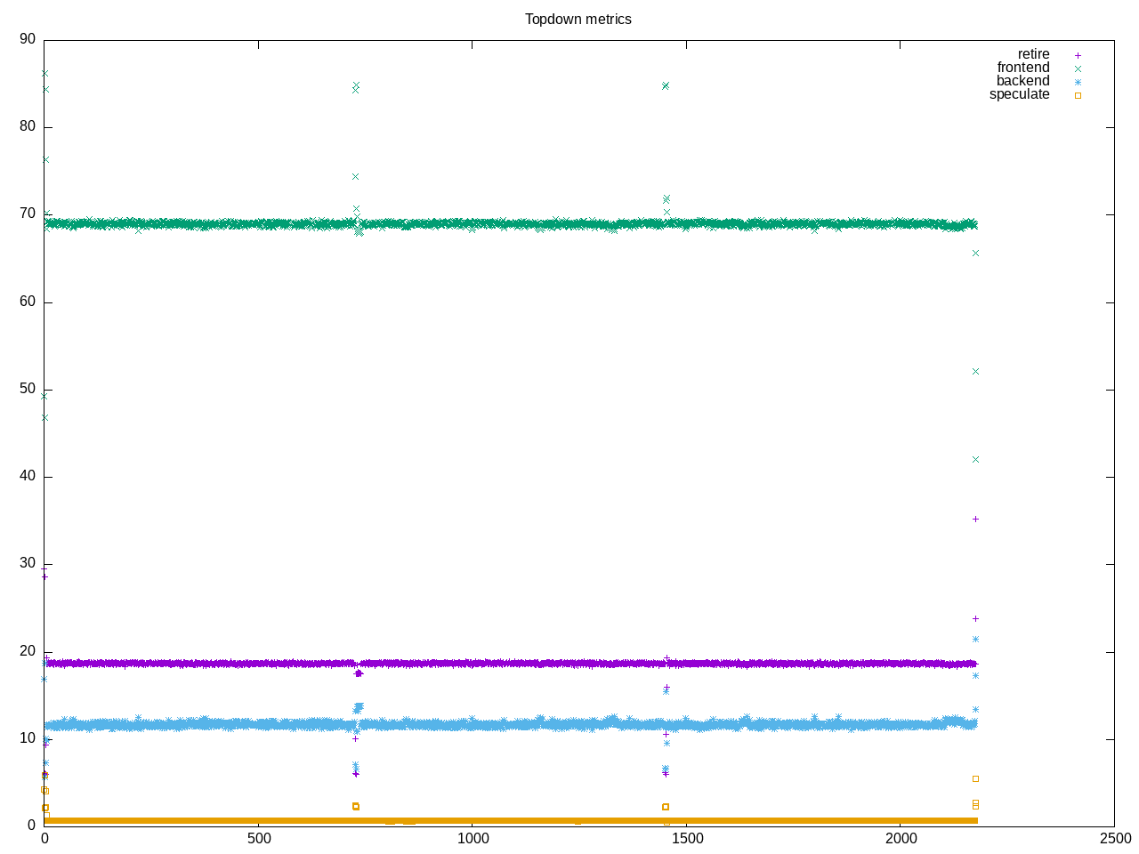 AMD metrics show a high frontend rate with a high opcache miss, not much floating point and medium L2 acces.