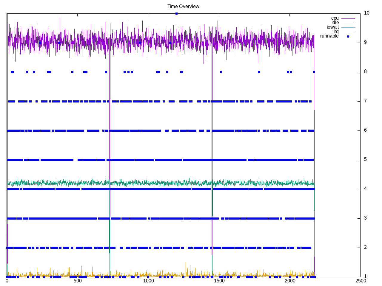 A test of file-system calls for testing disk performance. There are six different configurations and I picked the second smallest one. It produces one result. An interesting diviion of how many runnable processes up to the “6” I provided. Also a high amount of I/O wait as expected.