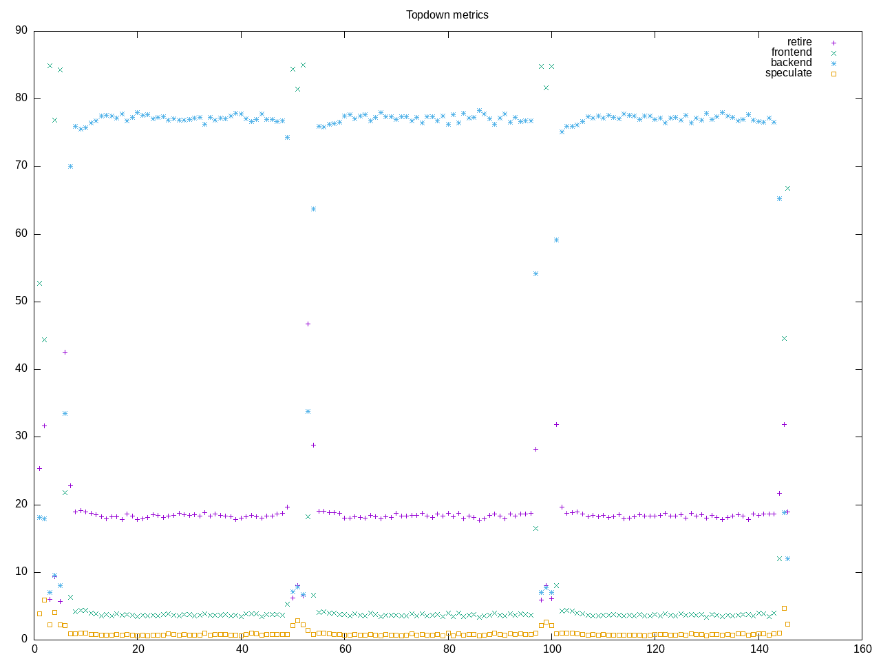 AMD metrics confirm a backend-stall heavy workload with low frontend stalls. There is not much floating point. A good amount of L2 access.