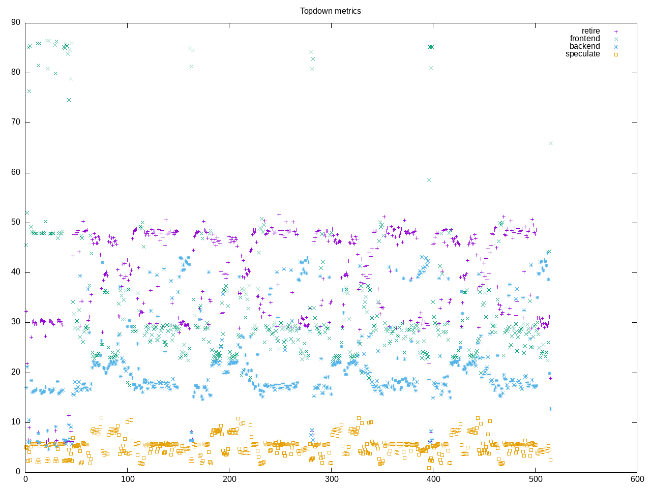 Topdown metrics with the timescales not matching the previous graph, also suggests this one could have quit the first workload early and mostly looking at the second workload where the retirement reaches highest point but also a blurring with frontend and backend stalls.