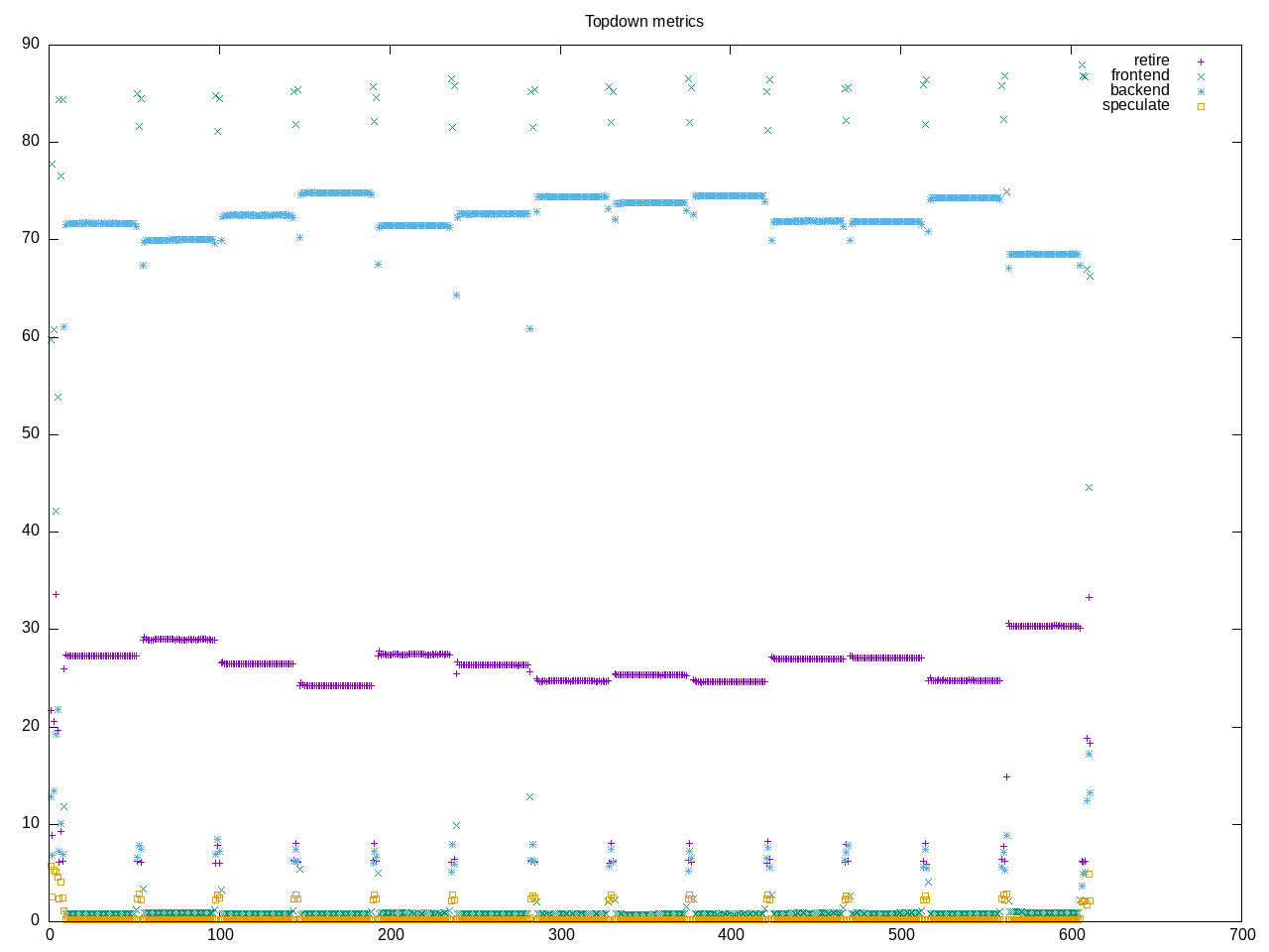 Topdown profile shows high backend stalls, both CPU and memory. It also suggests multiple rounds of tests to find a stable point. Frontend stalls are some of the smallest of all benchmarks. Perhaps interesting to see factors here like code/data footprint sizes?