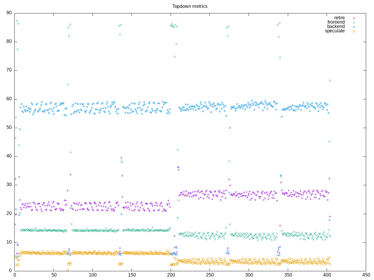 Topdown profile shows a consistent backend-bound nature with ~1/3 backend CPU and the other 2/3 are memory bound.