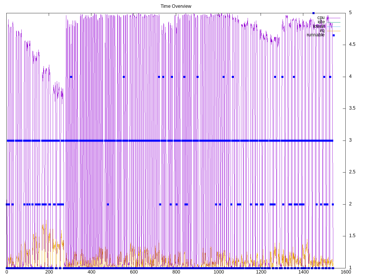 Topdown summary shows mostly two processes running but not spending much time and also a moderate level of interrupts. For example the initial section is TCP sockets with increasing message sizes.
