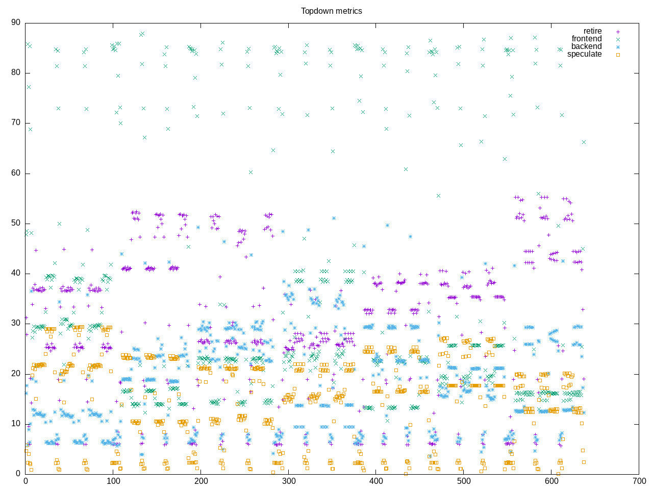 Topdown profile shows frontend and backend stalls about even but varying by the test case. Branch misprediction is surprisingly high.