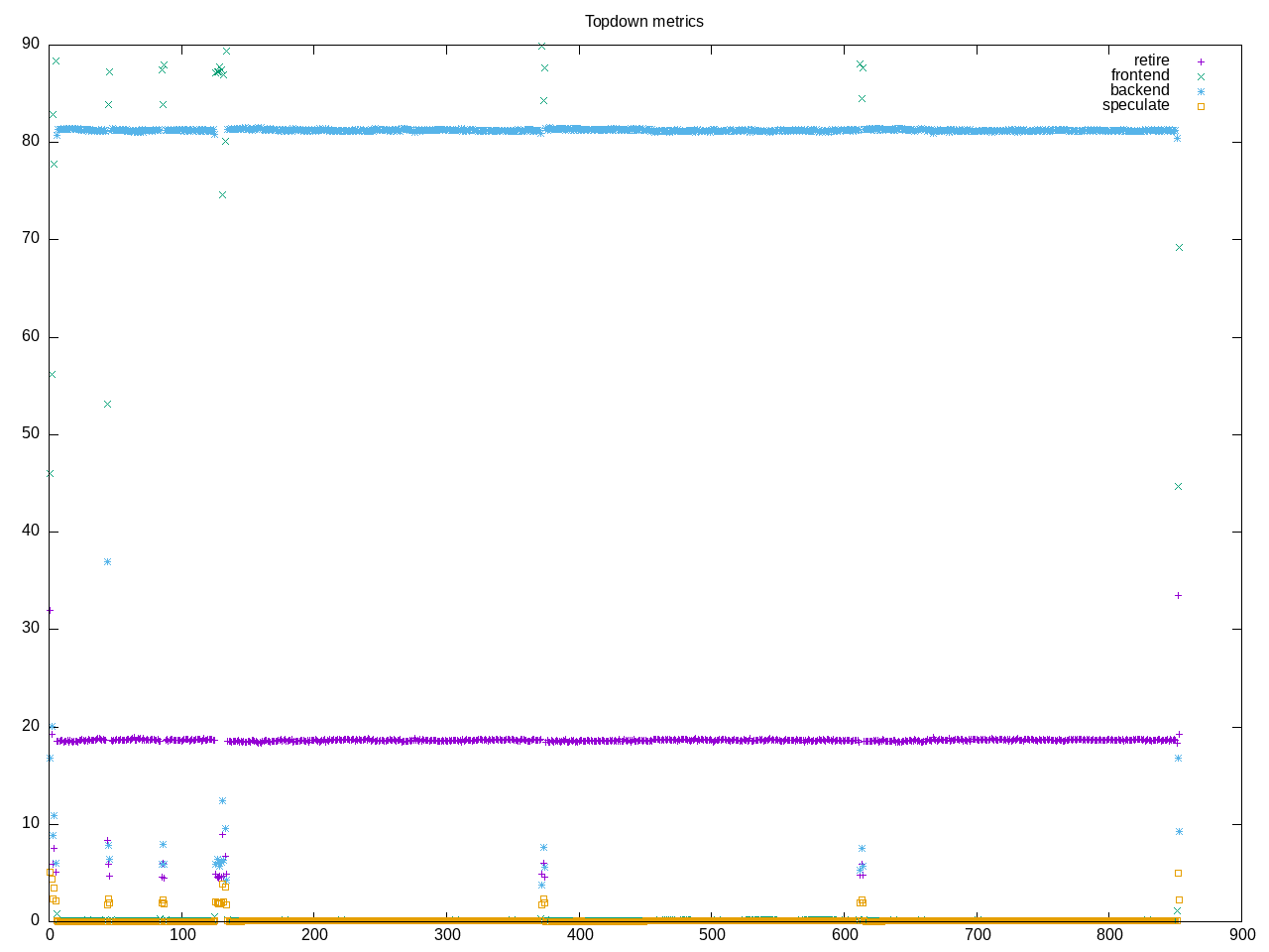 AMD metrics. The amount of frontend time is surprisingly low (0.1%), the backend CPU is higher than average. This is a floating point code that does much better on my AMD processor than Intel processor.