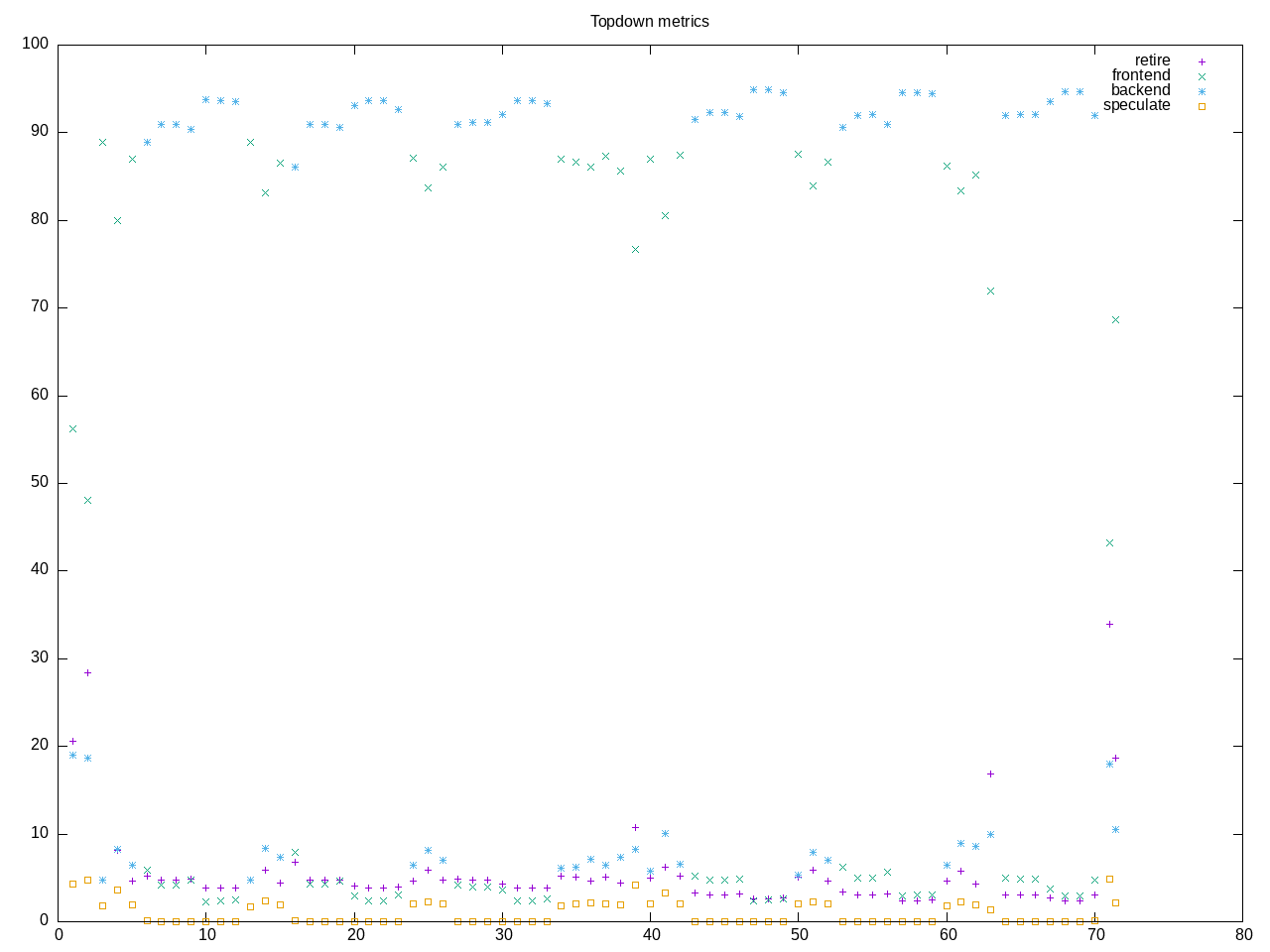 onednn is a neural network library, in this test convolution. Except for Stream, this is the most memory-bound application I observe. There are a few data points of front-end misses but overall frontend is low.
