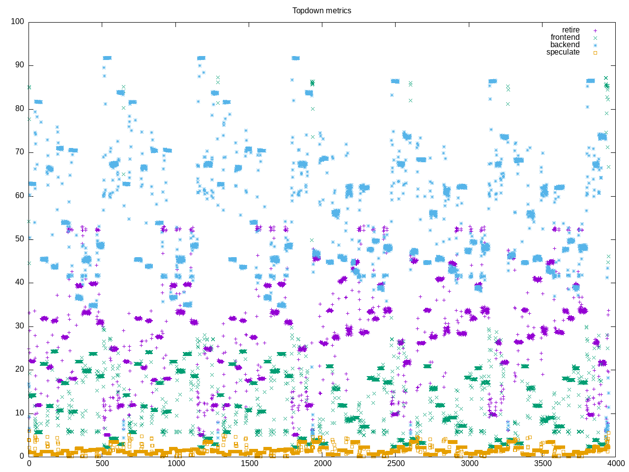 OpenVKL does “volume computational kernels” as part of Intel’s rendering toolkit. There are two workloads (and a third that does SYCL that didn’t run). Overall metrics are more middle of the road with some backend memory stalls but also ok retirement rate. Pattern below suggests multiple phases through the code.