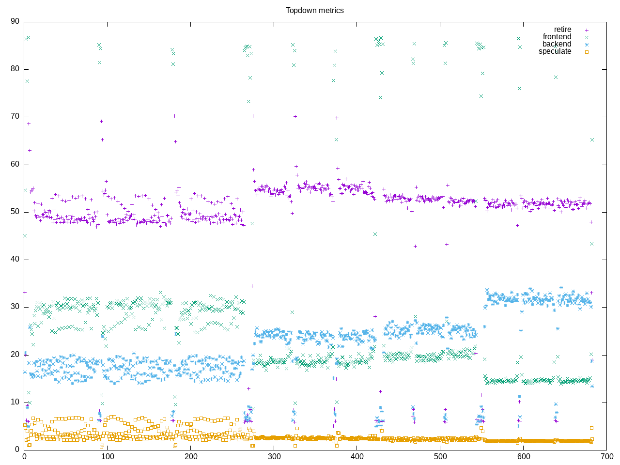 Topdown profile shows a consistent retirement rate with backend stalls higher in the last and frontend stalls higher in the first.