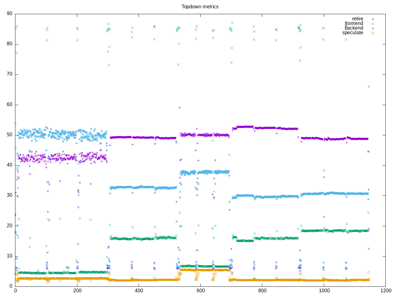 Topdown metrics show some variation in first workload vs. other three. Otherwise a higher retirement rate limited by backend stalls.